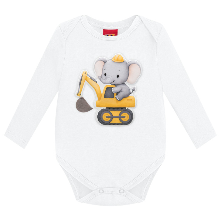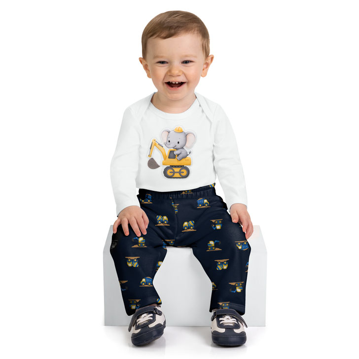 Destaque: O conjunto é composto por um body de manga longa em cotton macio e uma calça coordenada. Este modelo costuma apresentar estampas lúdicas e interativas, com cores modernas e vibrantes que mantêm o visual do bebé alegre e atualizado.