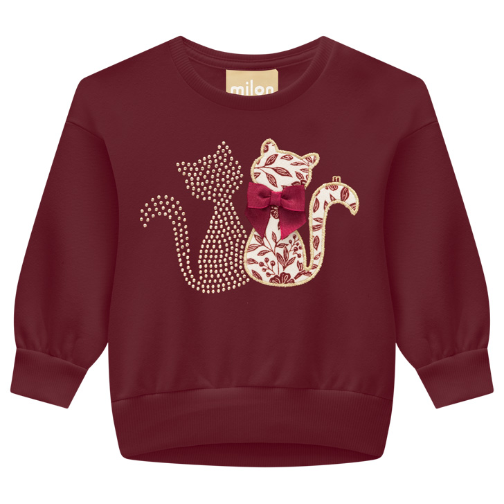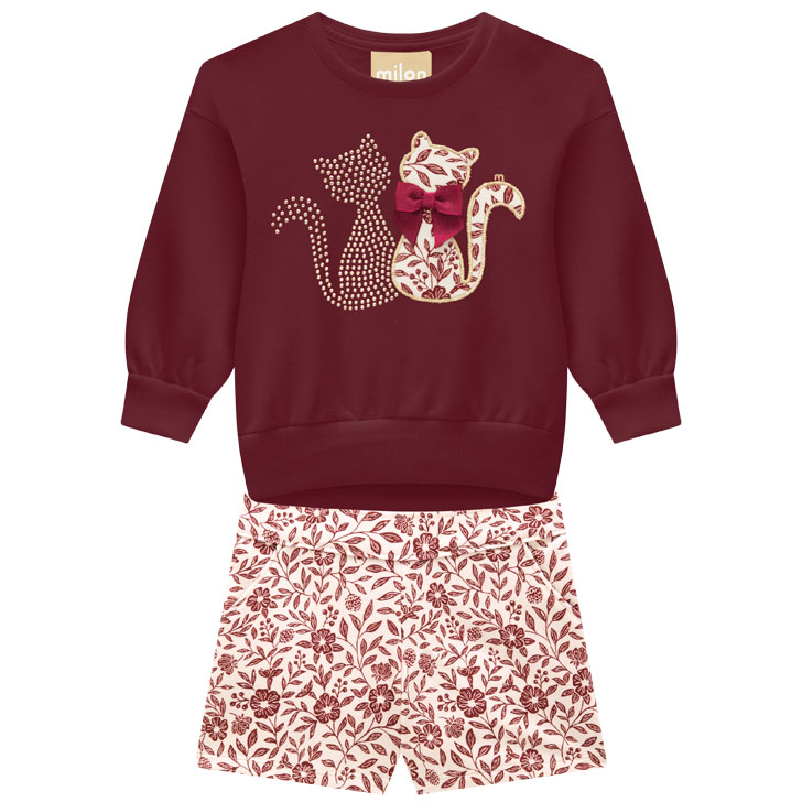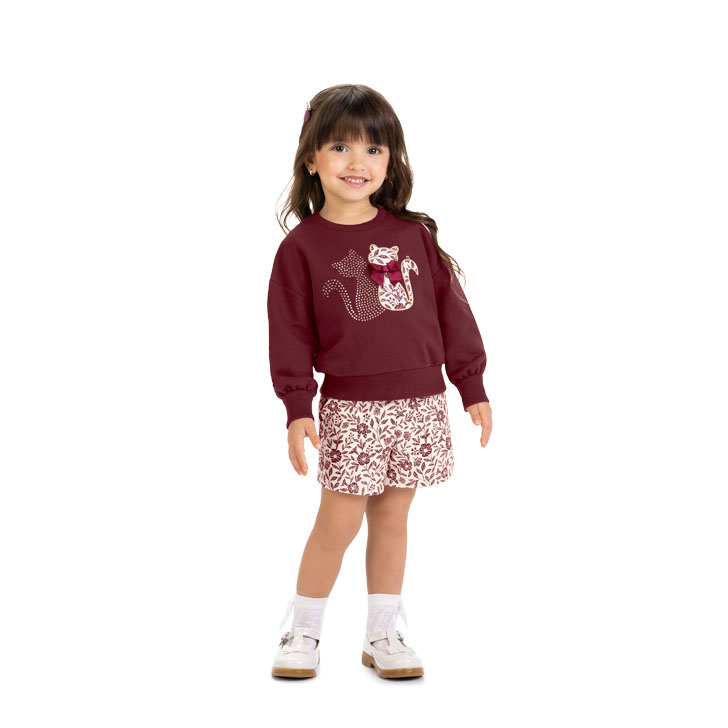 Destaque: O conjunto é composto por um blusão de manga longa em moletom macio e um shorts-saia (ou shorts) em moletinho com estampa floral. A blusa destaca-se pelo bordado de dois gatinhos com detalhes em strass, trazendo um brilho delicado e encantador à peça.