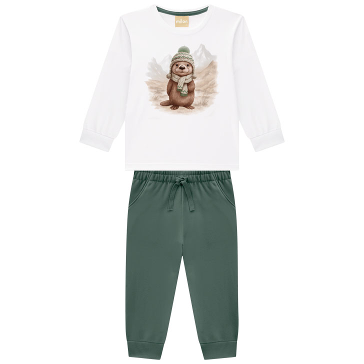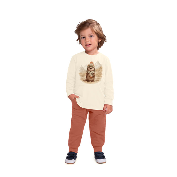 Calça Coordenada: Calça em tecido confortável (como o moletinho ou sarja leve) com cós elástico, facilitando o vestir e garantindo liberdade para as brincadeiras.