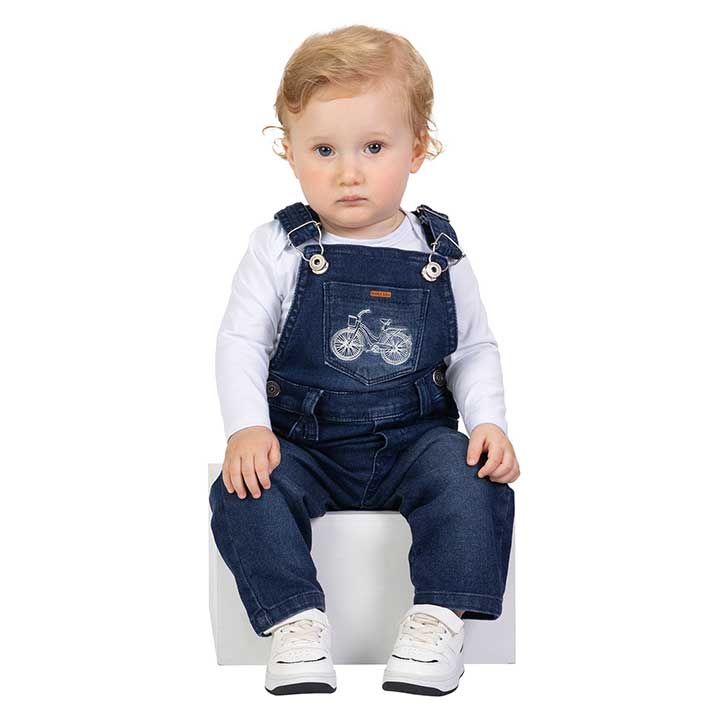 Destaque: Confeccionada em jeans 100% algodão de toque macio, apresenta uma lavagem especial com detalhes levemente desbotados. Possui bolso funcional no peito, alças ajustáveis com fivelas metálicas e botões laterais que facilitam o vestir.