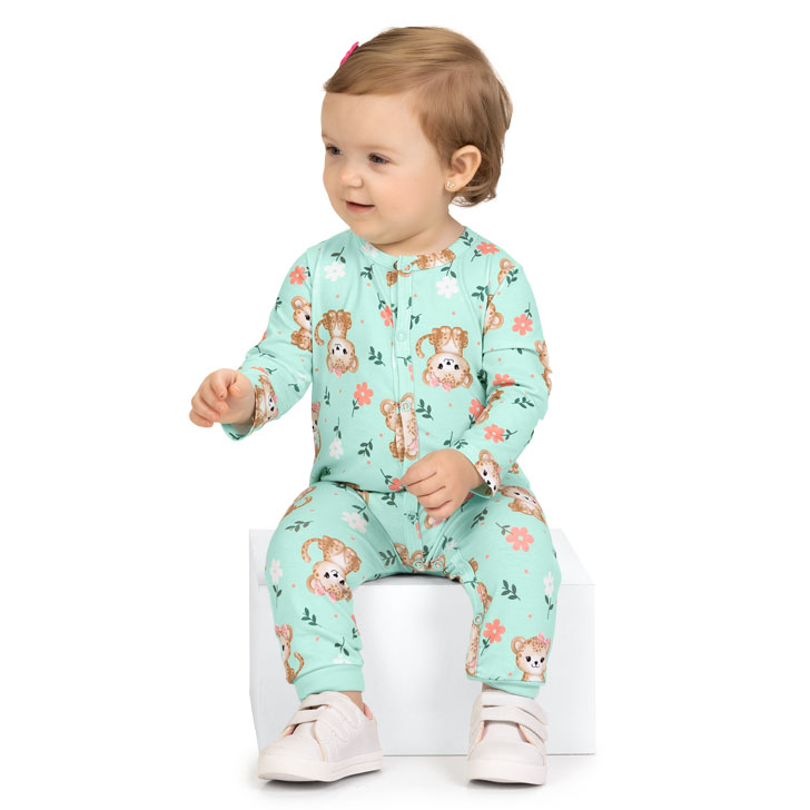 Diferencial Colmeia Kids: Conta com abertura frontal e entrepernas por botões de pressão, facilitando imensamente a rotina de trocas. Além disso, a modelagem é pensada para não prender os movimentos, permitindo que a bebê brinque e descanse com total liberdade.
